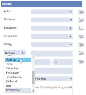 Außer den fest konfigurierten Eingabefeldern finden Sie in der Suchmaske noch zwei variable Felder. Hier können Sie von Fall zu Fall die nötige Suchbegriffsart auswählen.