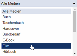 Mit Hilfe des Feldes Medien können Sie die Treffer auf bestimmte Medien wie Hörbücher oder Kalender einschränken. Tippen Sie auf das kleine Dreieck und wählen Sie aus dem Auswahlfenster einen Wert aus.